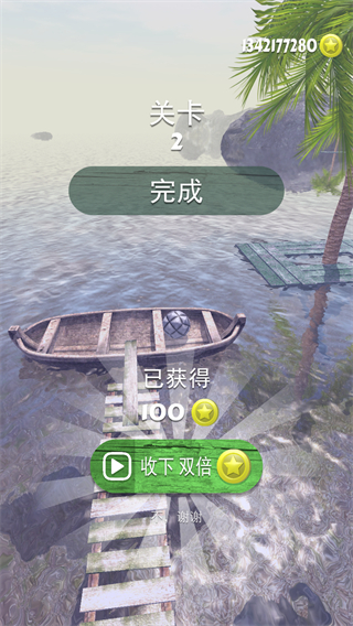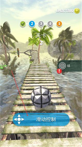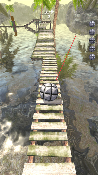 1、在关卡2中,通过滑动控制球体在木桥上滚动,保持平衡推进关卡。