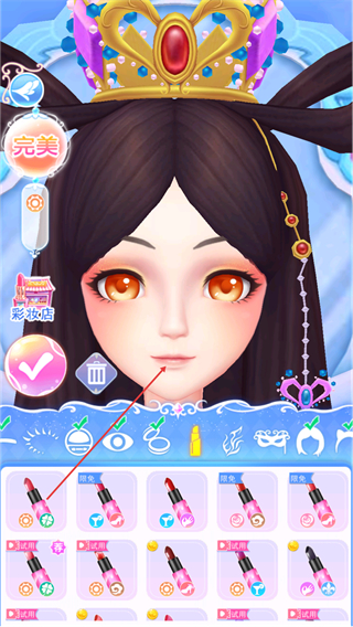 4、选择口红样式,为角色涂抹口红,进一步细化妆容,推进美妆进度。