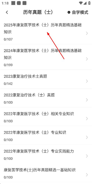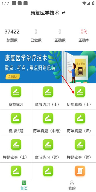 1、在康复医学技术首页点击历年真题选项,进入历年真题页面。