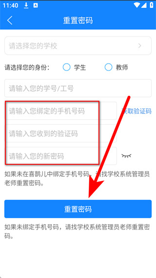 4、将收到的短信验证码填入验证码输入框,再设置新密码,即可完成密码重置。
