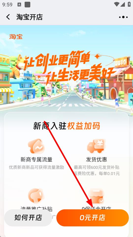 3、进入淘宝开店界面后,点击下方0元开店选项。