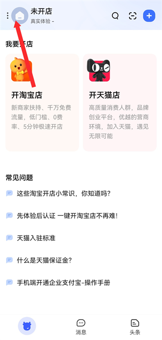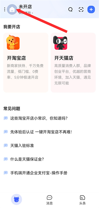 1、打开千牛APP点击左上角未开店标识,进入开店页面。