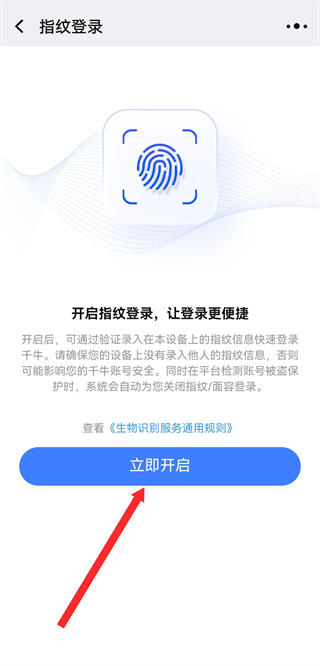 4、点击立即开启按钮,按照提示完成操作,即可开启指纹登录功能。