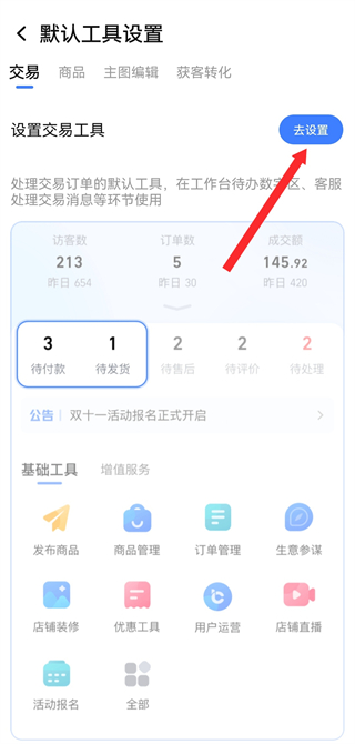 4.工作台:提供店铺关键数据,以及任务、交易、商品等常用操作入口