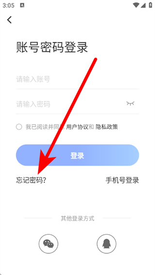 3、在账号密码登录页面,点击忘记密码,进入找回密码页面。