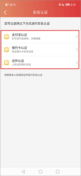 4、在实名认证界面,选择其中一种认证方式,按照提示完成信息提交即可完成实名认证。