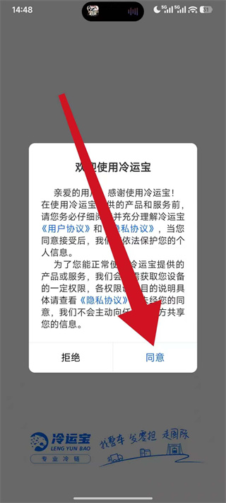 1、打开冷运宝,弹出协议弹窗后,点击同意,进入账号登录页面。