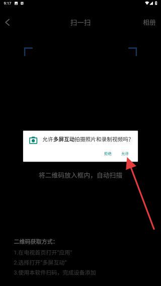 3、扫描电视二维码,若弹出允许拍照/录像提示,点击允许即可进行扫一扫。