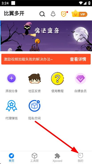 1、打开比翼多开APP,点击底部导航栏右下角我的选项。