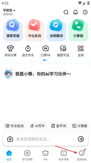 3、进入作业帮主界面,找到底部导航栏的签到有礼选项,点击该选项进入对应页面。