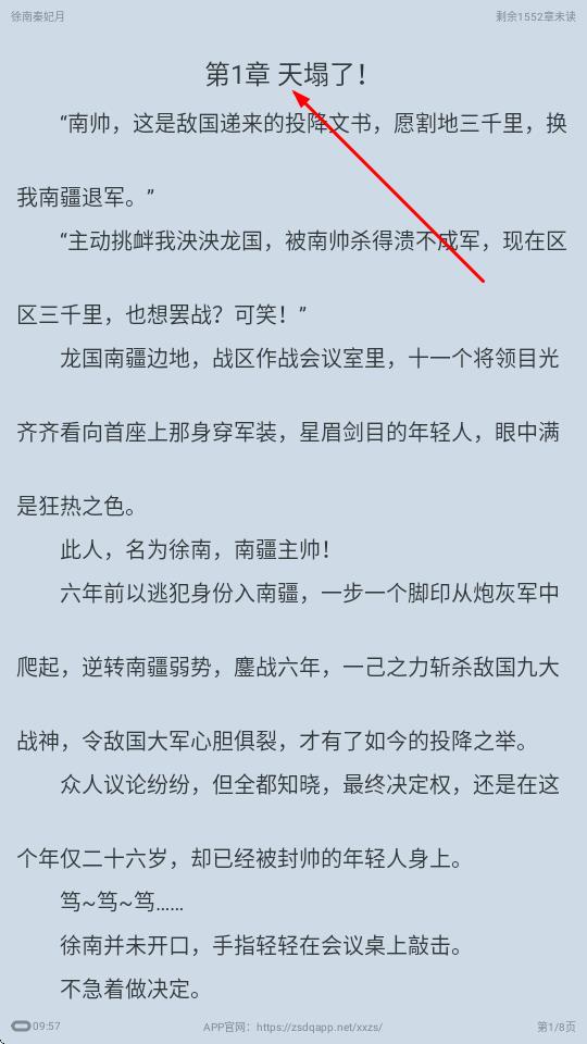3、选定书源后进入阅读页,浏览《徐南秦妃月》第1章天塌了内容,正式进入开启小说阅读。