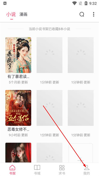 1、打开小小追书,点击底部书架,查看《徐南秦妃月》《极品逍遥王》等已收藏小说,了解更新时间。