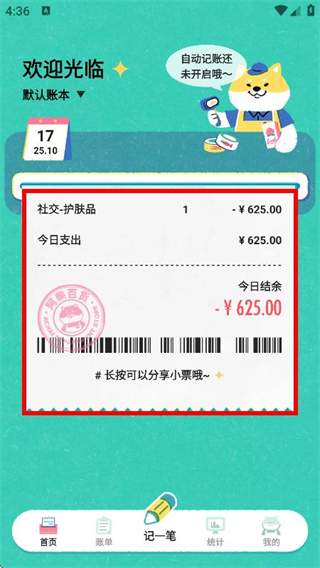 4、完成记账后,可在首页看到社交-护肤品等记账小票,展示今日支出等信息。