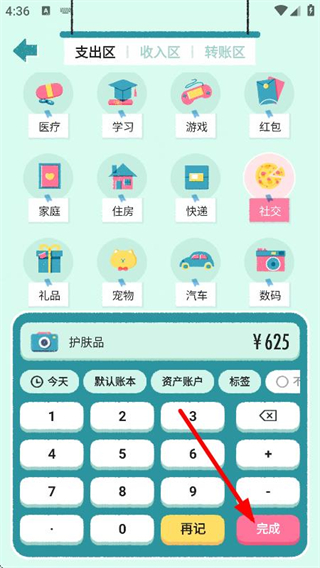 3、在记账金额填写页面,输入金额等信息后,点击完成,完成记账操作。