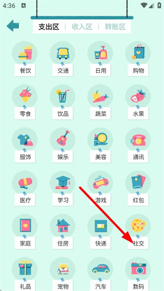 2、在记账分类选择页面,点击社交的分类,进入记账金额填写页面。