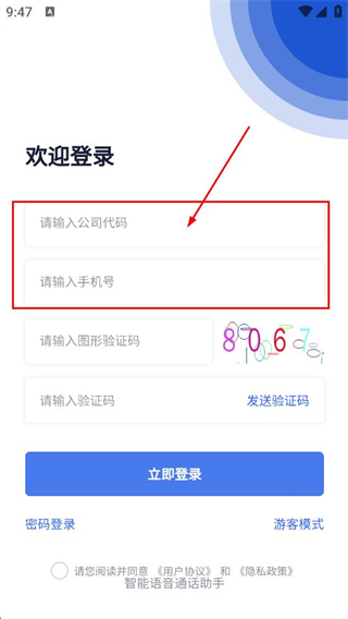 2、在验证码登录界面,填写请输入公司代码和请输入手机号对应的内容。