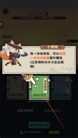 2、每关结束后,选择已获得的功法秘籍如玉女剑法提升属性,增强战力。