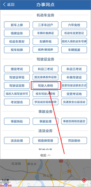 2、在办事网点页面的“驾驶证业务”分类下,点击驾驶人体检选项。