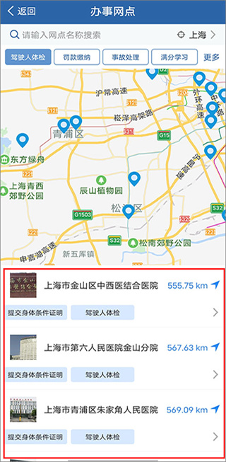 3、在驾驶人体检的办事网点列表中,选择对应的医院网点,即可前往进行体检。