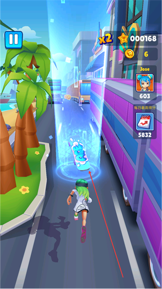 2、拾取道路上的滑板道具,触发滑板效果,提升移动效率并持续收集资源。