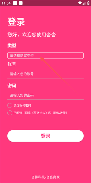 1、在沓沓的登录页面点击请选择商家类型,弹出商家类型选择界面。