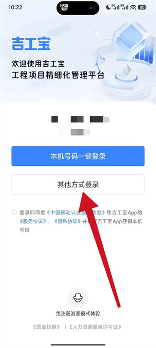 1、打开吉工宝,进入欢迎页面后,点击其他方式登录,进入登录方式选择页面。