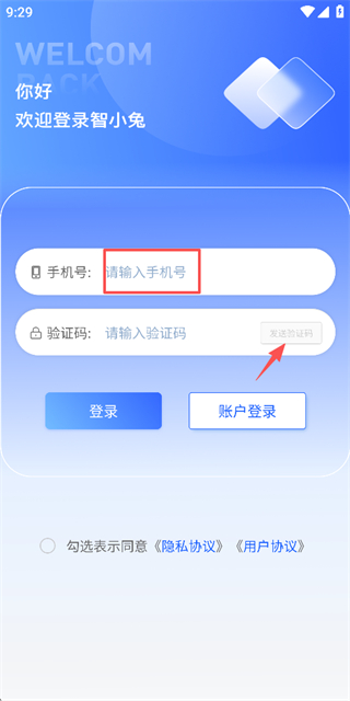 2、在登录页面填写手机号,勾选协议后,点击获取验证码。
