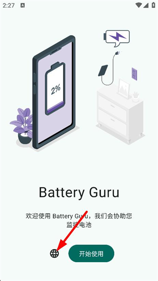 1、打开Battery Guru,点击欢迎界面的地球图标。