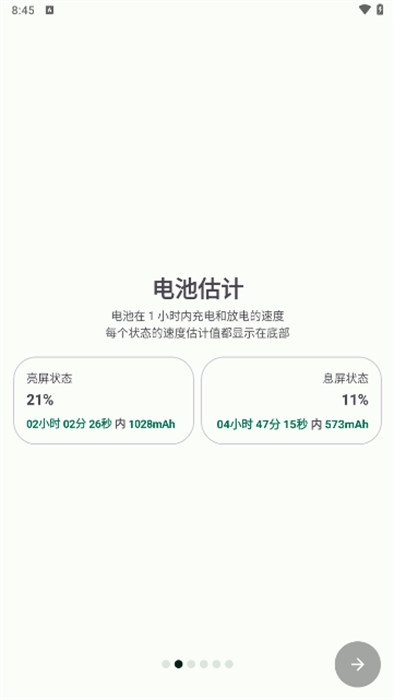 2、点击主界面中的持续时间板块,进入页面后,可切换放电选项卡,查看放电状态下的总时间、放电速度,以及亮屏、熄屏各自的使用电量和放电速度等详细数据。