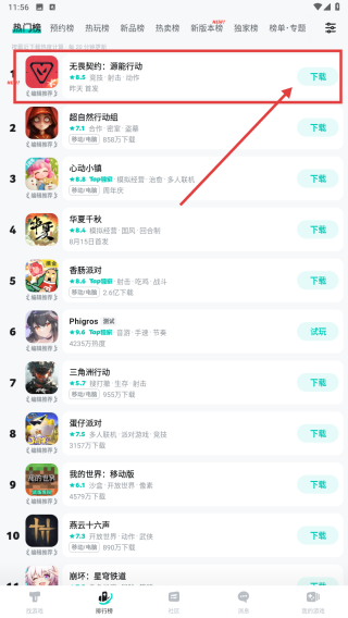 2、切换到下载页,找到想玩游戏如无畏契约 ,点击下载,获取游戏安装包,点击下载。