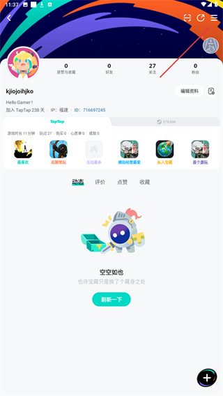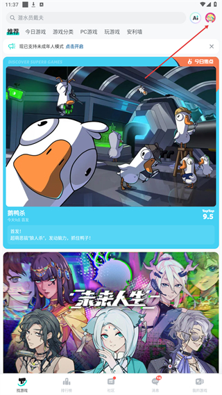 1、在TapTap主界面点击右上角的个人头像,进入个人中心页面。