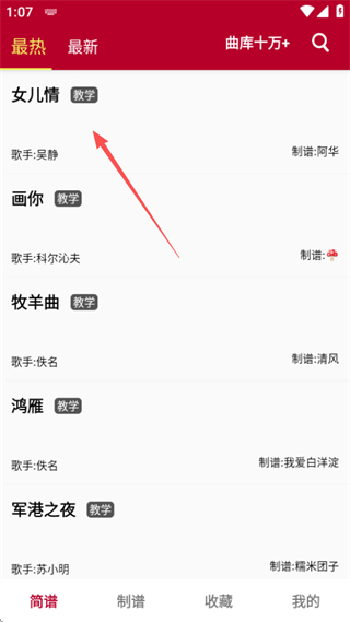 1、进入动态简谱后,点击目标歌曲条目,可进入该歌曲的简谱页面。