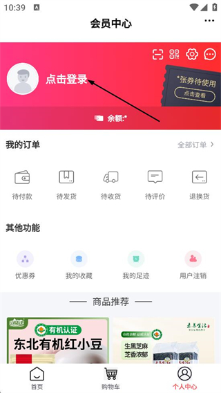 2、随后我们可以在会员中心页面,点击点击登录区域,进入登录页面。
