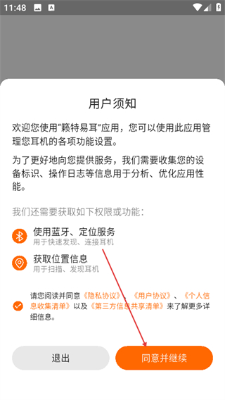 1、打开籁特易耳App,阅读相关协议后,点击同意并继续按钮,进入App的设备管理界面。