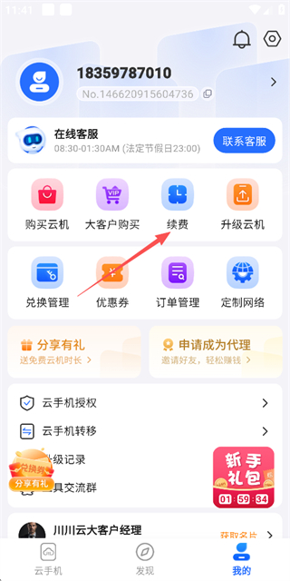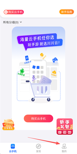 1、在川川云的云手机页面点击底部我的选项,进入个人中心页面。