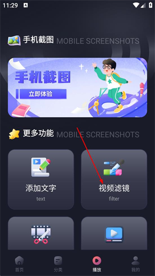 2、切换至标签页后,点击更多功能区域的视频滤镜选项,进入视频选择页面。