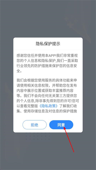 1、打开App后,在隐私保护提示弹窗中点击同意按钮,可进入登录页面。