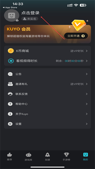 1、启动kuyo加速器,进入时点击右下方我的按钮。