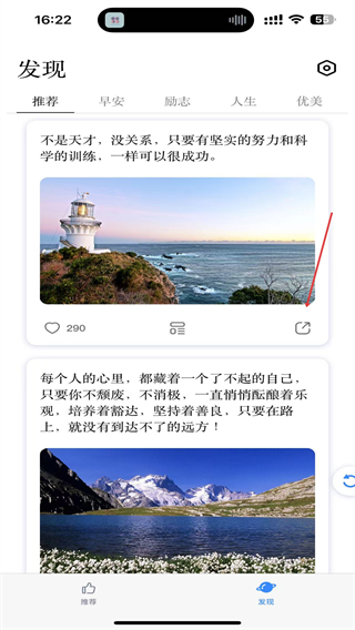 1、启动早安图片App,进入时点击右侧分享的按钮。