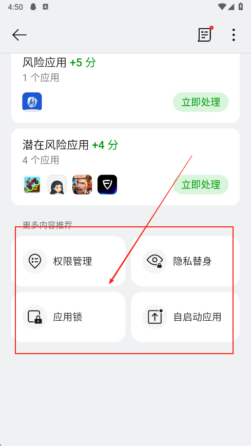 2、在应用管理相关页面,能看到风险应用,潜在风险应用提示,可点击立即处理进行操作,同时还有权限管理,隐私替身,应用锁,自启动应用等功能选项。