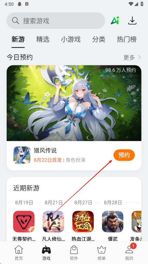 3、切换到游戏页面,可看到新游,精选,小游戏等分类,在今日预约板块,看到感兴趣的游戏如猎风传说,点击预约按钮,即可预约该游戏,也能浏览近期新游等内容。