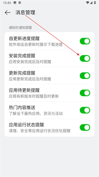 4、找到安装完成提醒对应的开关按钮,点击开启即可。