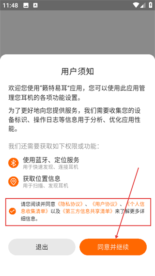 1、在用户须知页面,勾选信息后点击同意并继续按钮,进入设备列表界面。