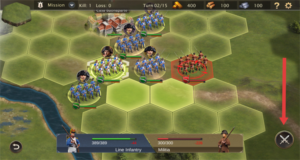 3、部队移动至敌人附近后,点击攻击按钮,发动战斗,消耗敌方部队血量。