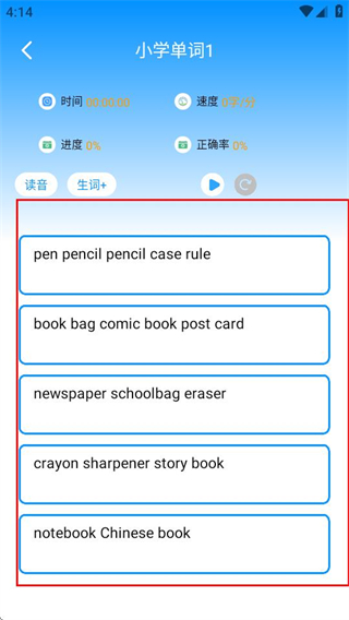 2、在英语单词练习页面,选择目标学段,可进入对应学段的单词练习列表。