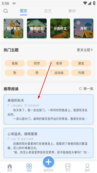1、进入首页后,点击底部的阅读选项,可进入范文页面。