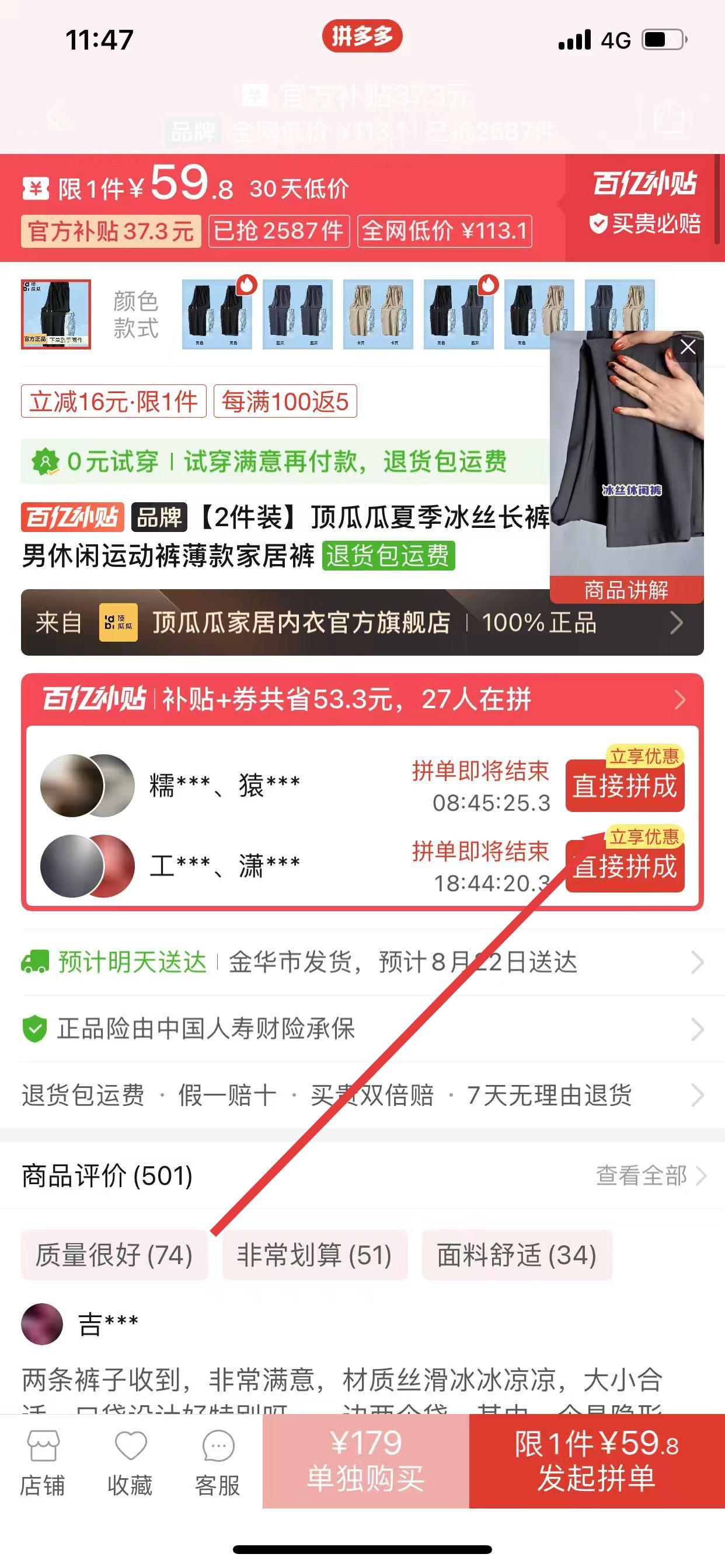 2、在商品详情页面,确认商品的款式、颜色、规格等信息符合需求后,点击发起拼单或直接拼成按钮。