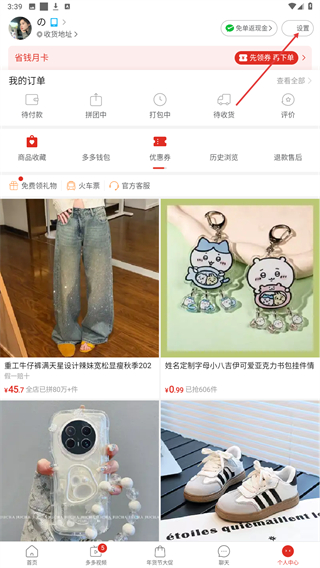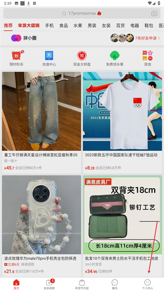 1、在进入到拼多多首页中,可以点击个人中心按钮,进入个人中心页面。