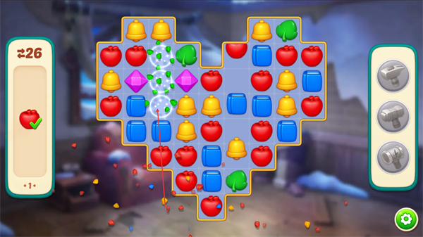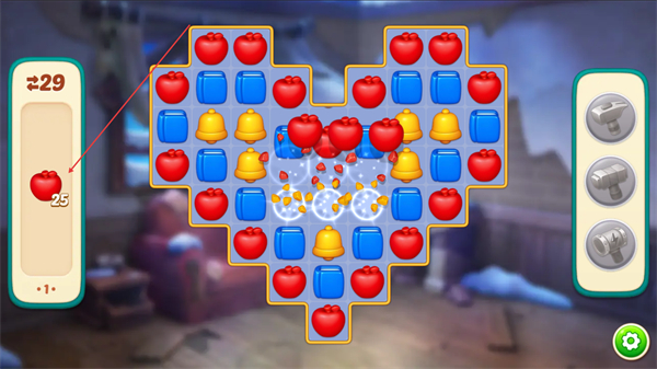 2、消除相同图案如红色苹果,积累左侧进度条的数值,推进关卡。