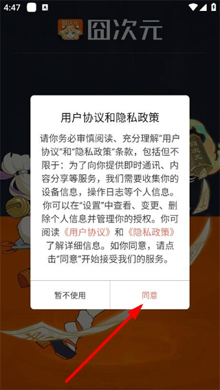 1、打开囧次元,在弹窗中点击同意,进入登录界面。